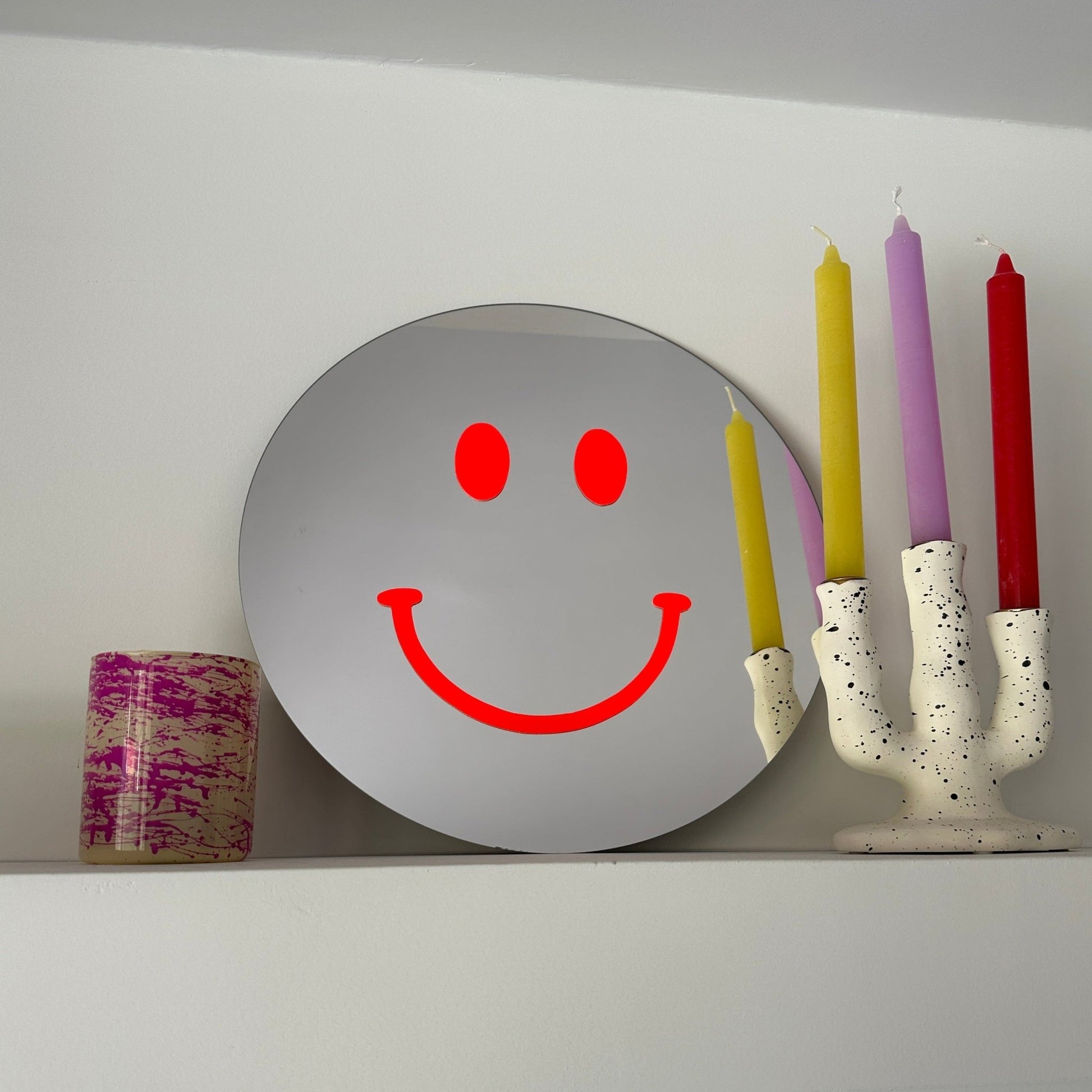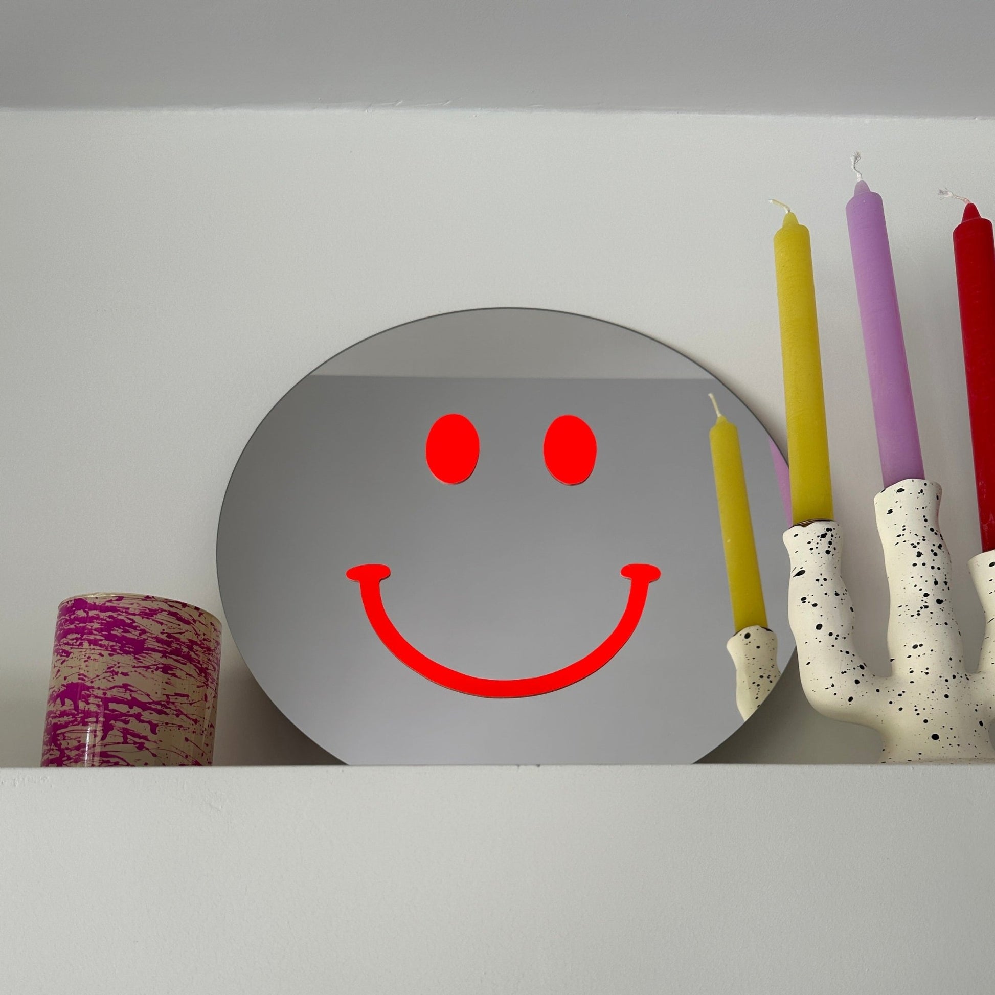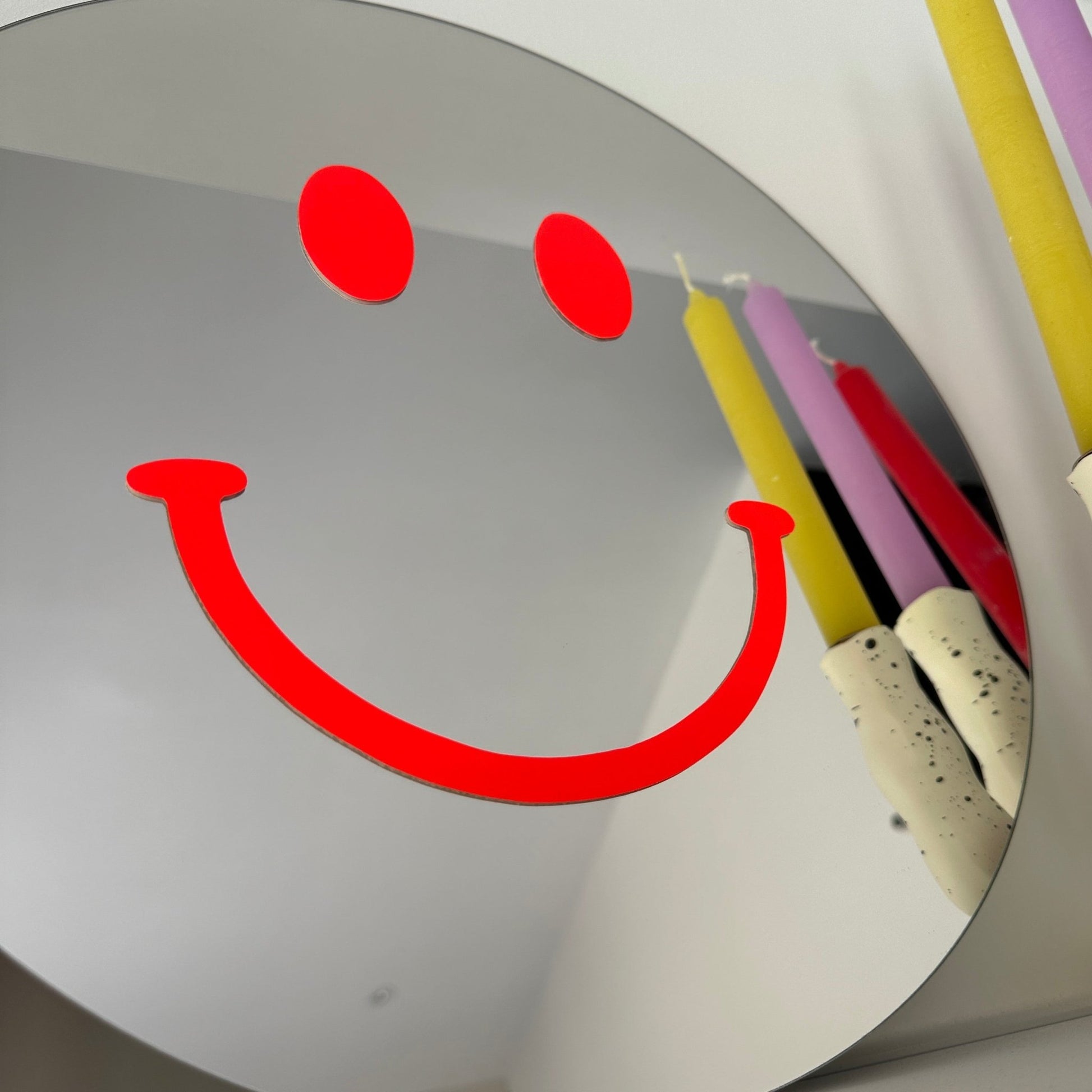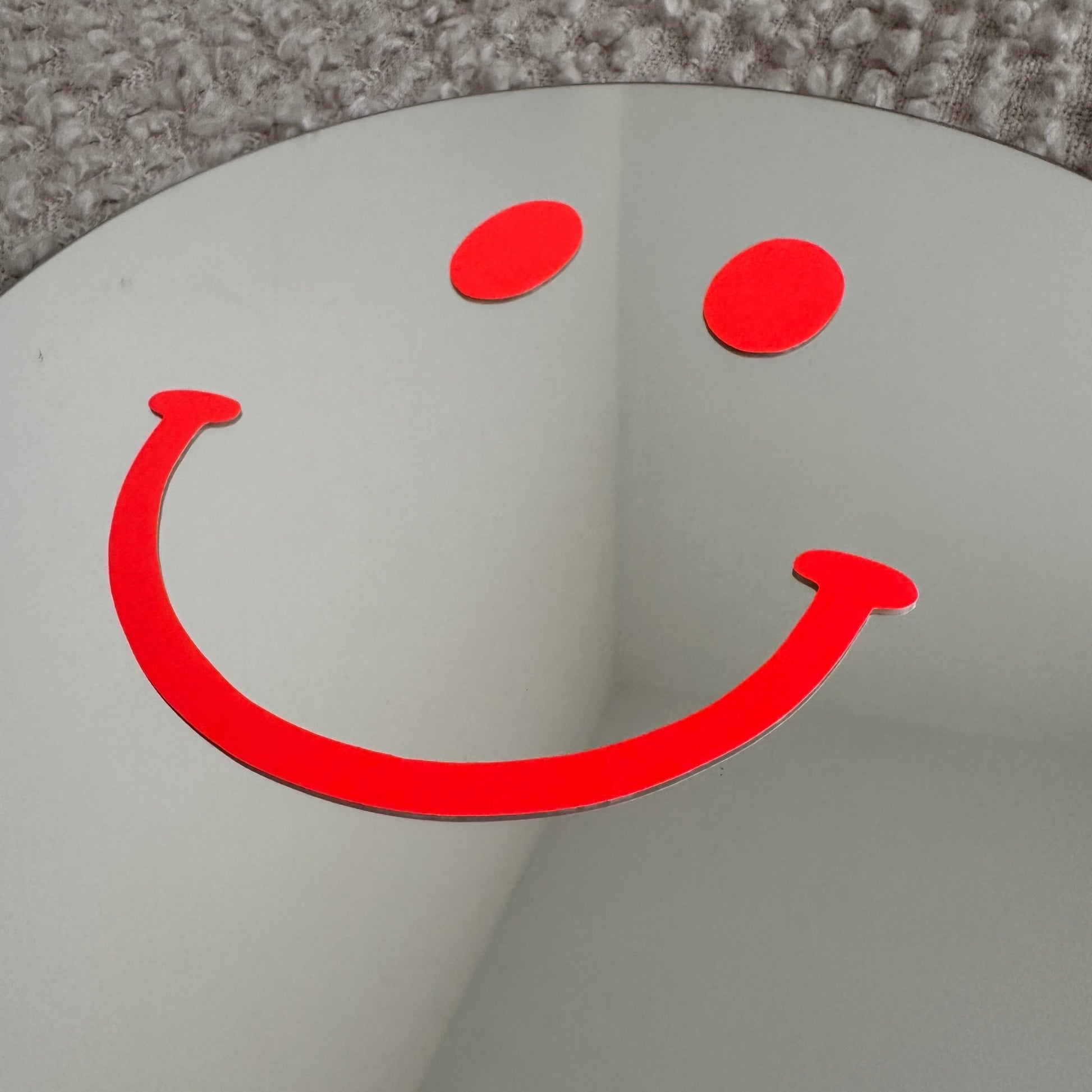 Handgefertigter runder Spiegel mit neonorangem Smiley-Gesicht